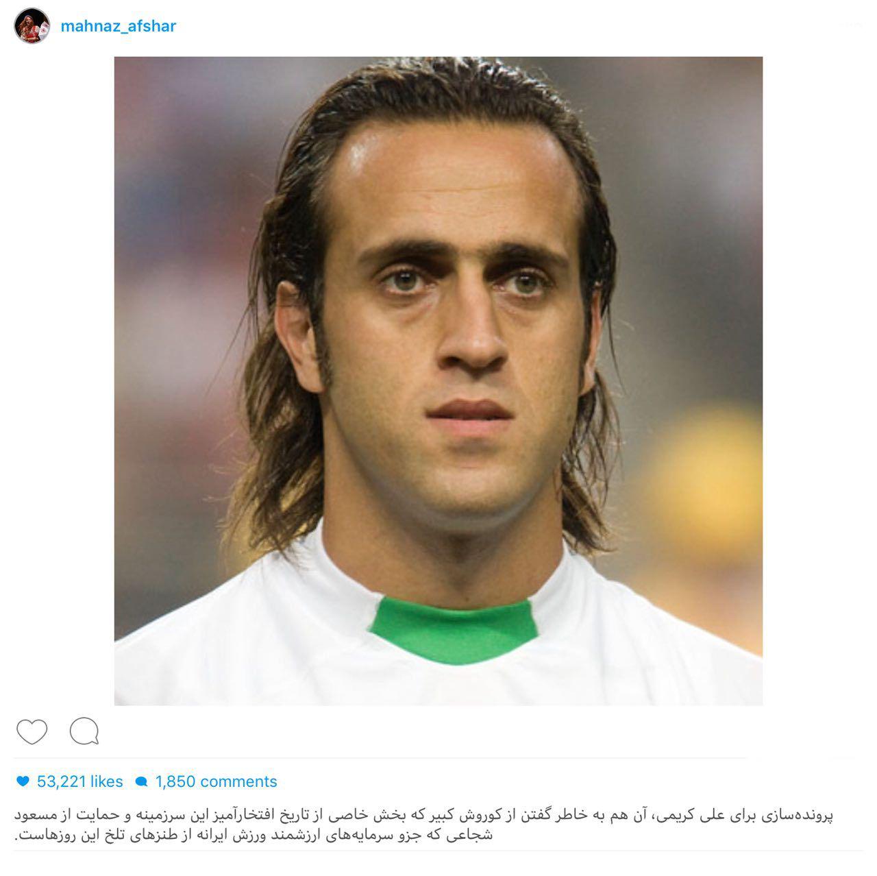 در جدید ترین این افراد مهناز افشار بازیگر سینمای ایران نیز حق را به علی کریمی داده و از این اسطوره فوتبال ایران حمایت کرده است.