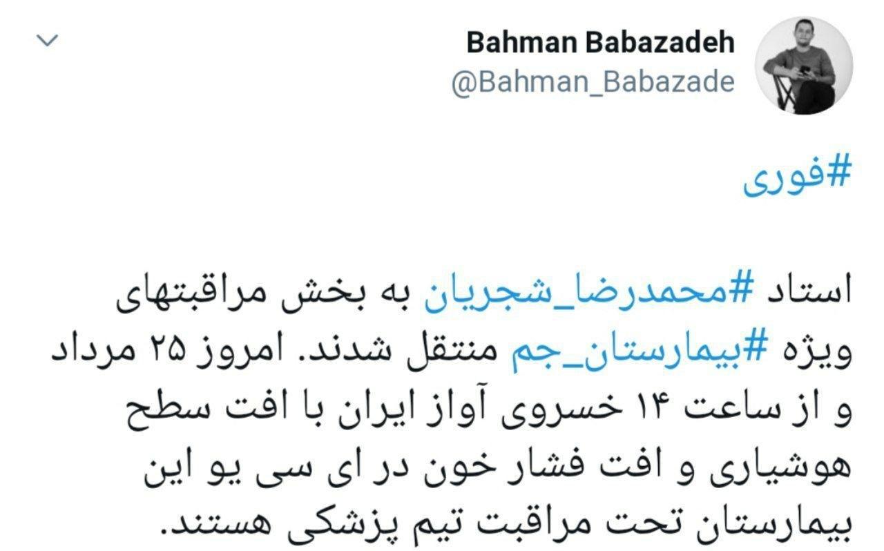 بهمن بابازاده؛خبرنگار حوزه موسیقی اعلام کرد استاد شچریان دوباره به بیمارستان و بخش مراقب های ویژه منتقل شده است.