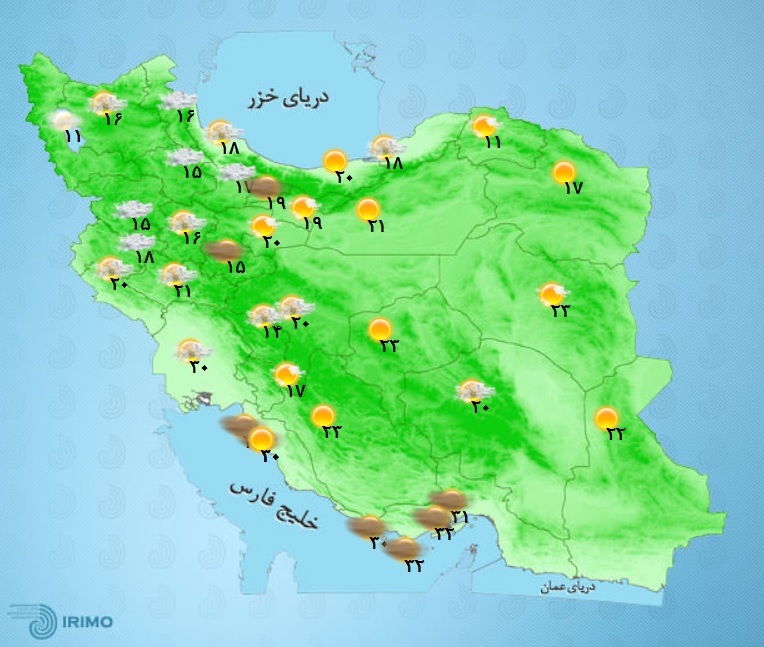 سازمان هواشناسی امروز برای آذربایجان شرقی، آذربایجان غربی، اردبیل، کردستان، زنجان، دامنههای جنوبی البرز واقع در قزوین و البرز، مناطقی از دامنههای زاگرس واقع در همدان و مرکزی در ساعات بعدازظهر افزایش ابر، رگبار پراکنده و وزش باد گاهی رعد و برق و وزش باد شدید پیشبینی کرد. در مناطق مستعد خیزش گرد و خاک دور از انتظار نیست.