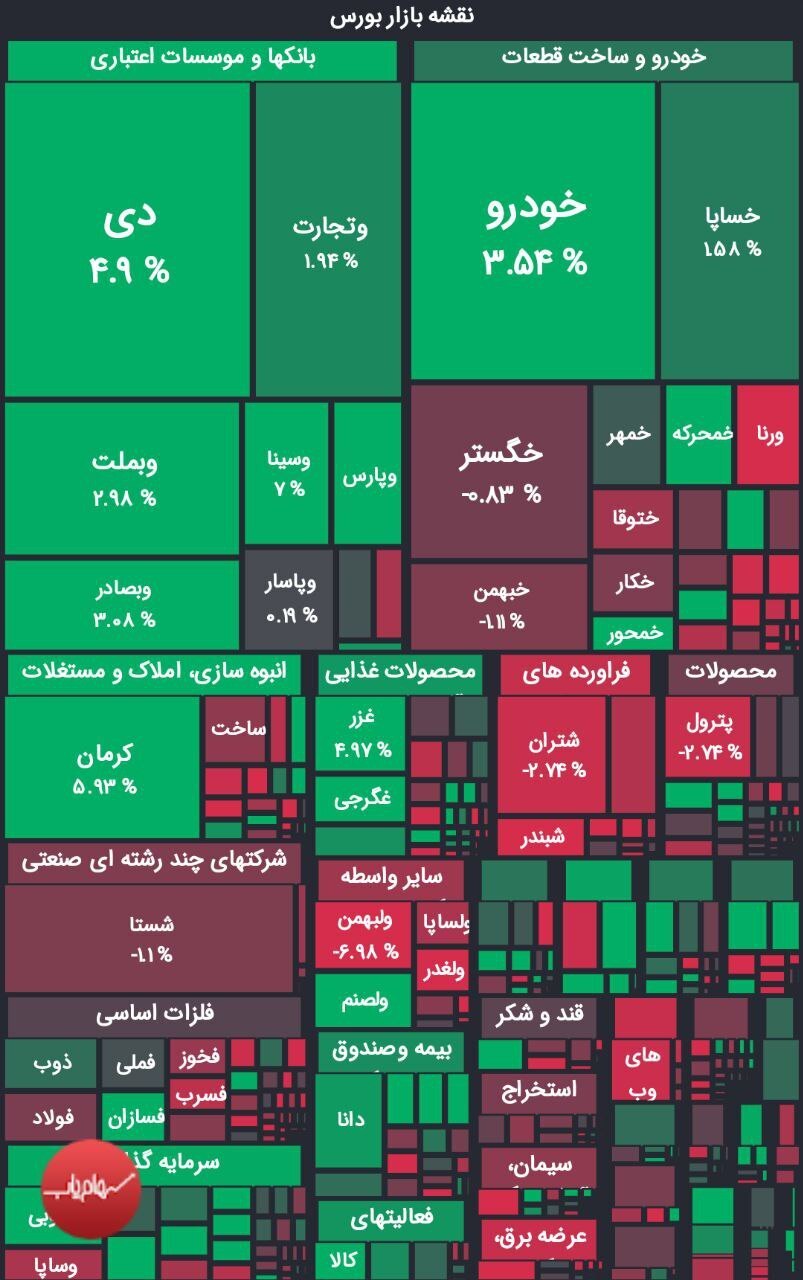 شاخص بازار اول، ۱۰ هزار و ۱۶۴ واحد و شاخص بازار دوم، ۲۰ هزار و ۷۵۴ واحد کاهش را ثبت کردند.امروز در معاملات بورس تهران، بیش از ۱۳ میلیارد و ۵۴۴ میلیون سهم، حق‌تقدم و اوراق بهادار به ارزش ۷۳ هزار و ۱۹۶ میلیارد ریال معامله شد. همچنین کشتیرانی جمهوری اسلامی ایران (حکشتی) با ۷۳۴ واحد، بانک ملت (وبملت) با ۳۱۸ واحد، بانک پارسیان (وپارس) با ۲۸۷ واحد، ایران خودرو (خودرو) با ۲۷۷ واحد، بانک صادرات ایران (وبصادر) با ۲۳۲ واحد و بانک تجارت (وتجارت) با ۲۱۱ واحد تاثیر مثبت بر شاخص بورس داشت.