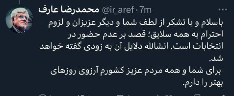 محمدرضا عارف با انتشار توییتی اعلام کرد که در انتخابات ریاست جمهوری شرکت نمی‌کند: