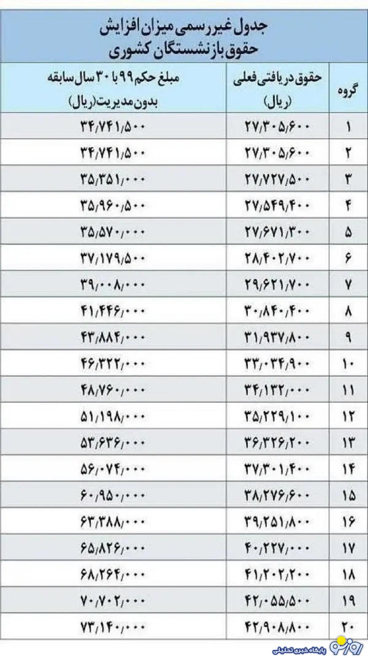 در پایان گفتنی است، این جدول مربوط به بازنشستگان صندوق بازنشستگی کشوری بوده و هیچ گونه ارتباطی با بازنشستگان صندوق تامین اجتماعی ندارد.