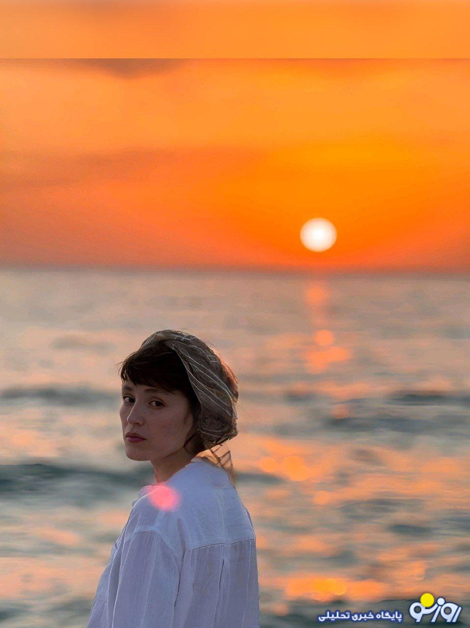 عکس/ ژست هنری فرشته حسینی در کنار دریا با مینی اسکارف حریر