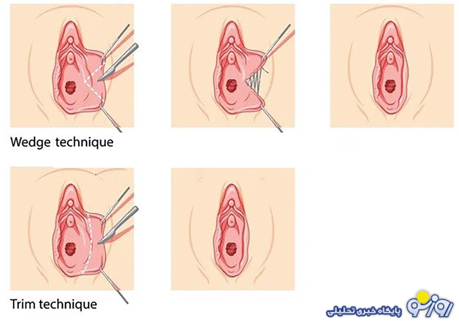 1. روش برداشت(Trim Technique): در این روش، بافت اضافی لابیا مینور برداشته می‌شود و لبه‌های آن صاف و یکدست می‌شوند. این روش ساده‌تر است و زمان بهبودی کوتاه‌تری دارد.