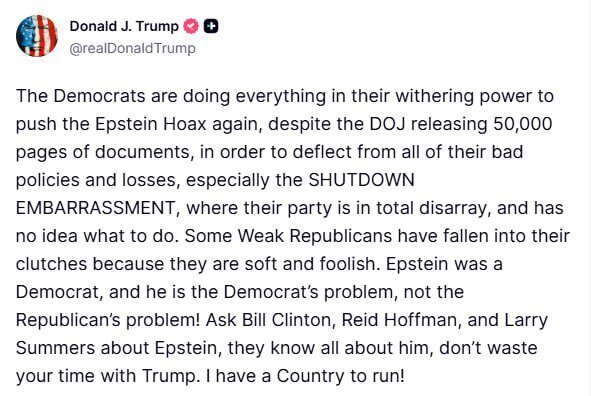 ترامپ در شبکه اجتماعی خود نوشت: دموکرات‌ها با وجود انتشار ۵۰ هزار صفحه سند توسط وزارت دادگستری، تمام تلاش خود را می‌کنند تا دوباره فریب اپستین را پیش ببرند تا توجه‌ها را از تمام سیاست‌های بد و شکست‌هایشان، به ویژه رسوایی تعطیلی دولت، که حزبشان در آن کاملاً آشفته است و نمی‌داند چه باید بکند، منحرف کنند. برخی از جمهوری‌خواهان ضعیف به دلیل سهل‌انگاری و حماقتشان در چنگال آنها افتاده‌اند. اپستین یک دموکرات بود و او مشکل دموکرات‌ها است، نه مشکل جمهوری‌خواهان! از بیل کلینتون، رید هافمن و لری سامرز در مورد اپستین بپرسید، آنها همه چیز را در مورد او می‌دانند، وقت خود را با ترامپ تلف نکنید. من یک کشور برای اداره کردن دارم!