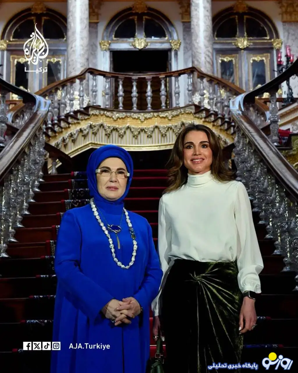 امینه (همسر اردوغان رئیس جمهوری ترکیه) از "رانیا" ملکه اردن و همسر پادشاه این کشور (عبدالله دوم) در استانبول ترکیه استقبال کرد.